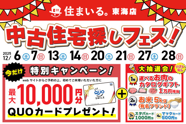 中古住宅専門店住まいる。東海店では、2025年11月15日(土)・16日(日)・22日(土)・23日(日)・24日(祝)・29日(土)・30日(日)に、『中古住宅探しフェス!』を開催いたします!