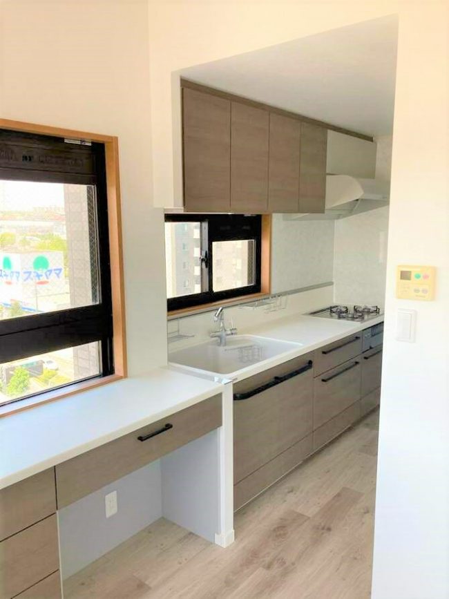 - カウンター・シンクはメーカーオリジナルの人工大理石が使用されており、汚れ・キズ・衝撃・熱に強く、人工大理石のデメリットが改善された素材なので、安心して使用できます!キッチン横には新たに作業スペースを作りました!家族や友人と料理やお菓子作りなど、楽しい日々を送ることができるようになりました!