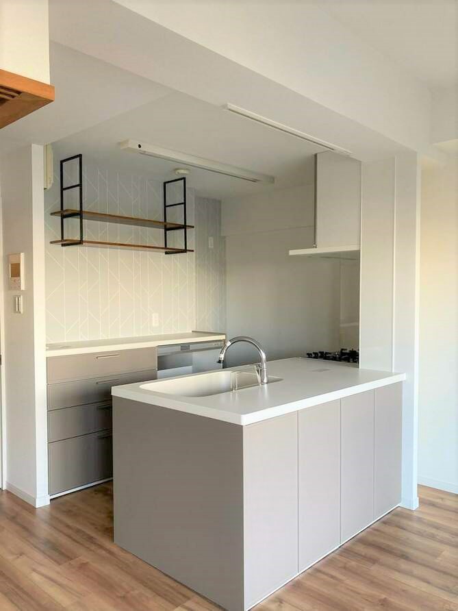 - キッチン周りの壁がなくなったことで空間が広がり、広々とした印象のリビングになりました!キッチンで作業している時もリビングを見渡すことができるので、家族とのコミュニケーションも取りやすくなりました!天然木の質感を再現したフロアは足ざわりが良く、またキズに強く、変色・退色もし難くなっています!