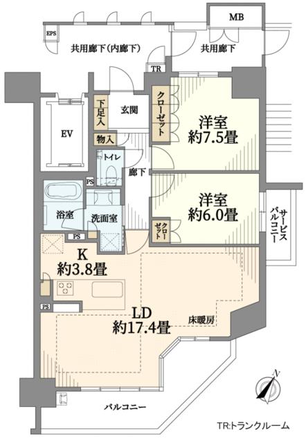 間取り | 2LDK | 間取り内訳 | LDK17.4畳 洋7.5畳 洋6畳 |