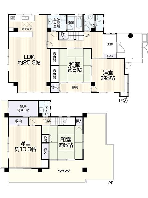 | 設備 | トイレ2ヶ所、床下収納、都市ガス、上水道、下水道、庭、駐車場2台分 | ||
