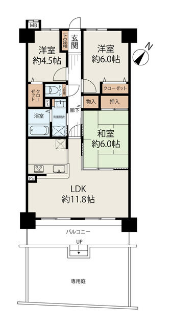 | 間取り | 3LDK | 間取り内訳 | 和6畳×1室 洋4.5畳×1室 洋6畳×1室 LDK11.8畳×1室 |