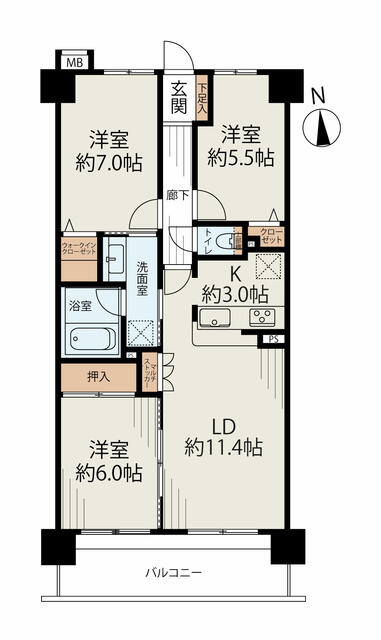 | 間取り | 3LDK | 間取り内訳 | 洋5.5畳×1室 洋6畳×1室 洋7畳×1室 LDK14.4畳×1室 |