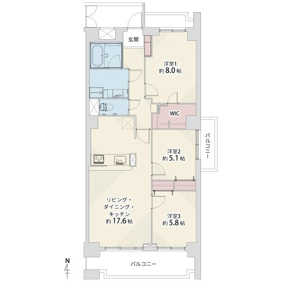 | 間取り | 3LDK | 間取り内訳 | LDK17.6畳×1室 洋8畳×1室 洋5.8畳×1室 洋5.1畳×1室 |