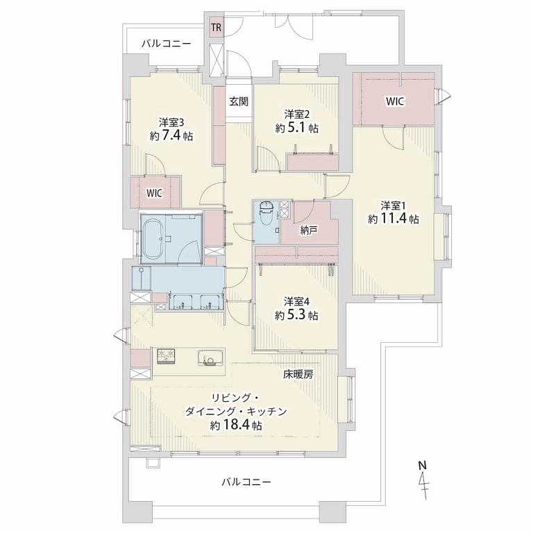 | 間取り | 4LDK | 間取り内訳 | LDK18.4畳×1室 洋11.4畳×1室 洋7.4畳×1室 洋5.3畳×1室 洋5.1畳×1室 |