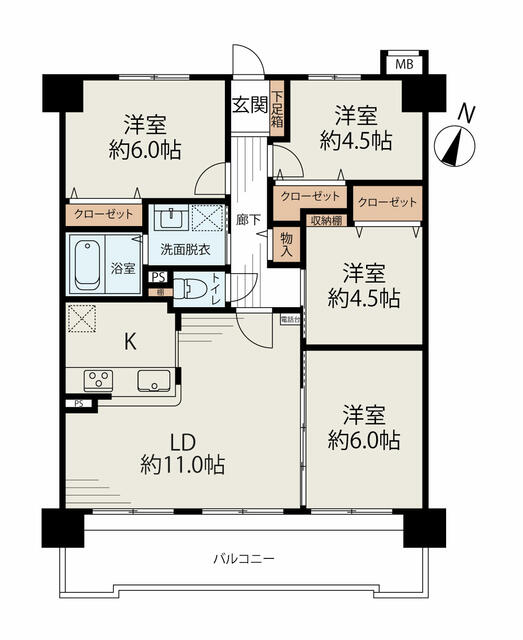 | 間取り | 4LDK | 間取り内訳 | 洋4.5畳×2室 洋6畳×2室 |