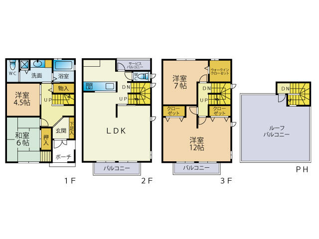 | 設備 | トイレ2ヶ所、カウンターキッチン、IHクッキングヒーター、食器洗浄乾燥機、ウォークインクローゼット、照明器具、電気、上水道、下水道、エアコン、ルーフバルコニー、駐車場3台分、[シューズインクローゼット] | ||